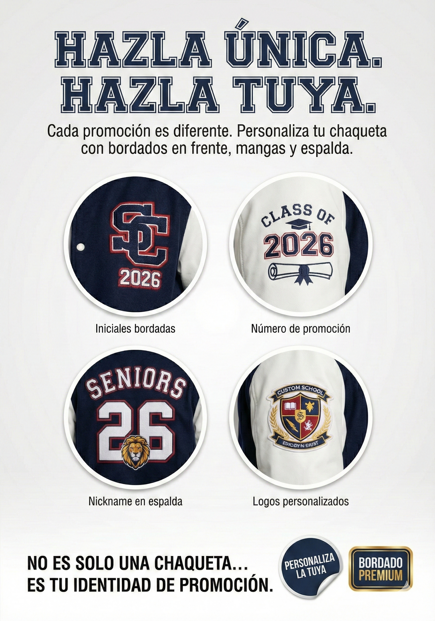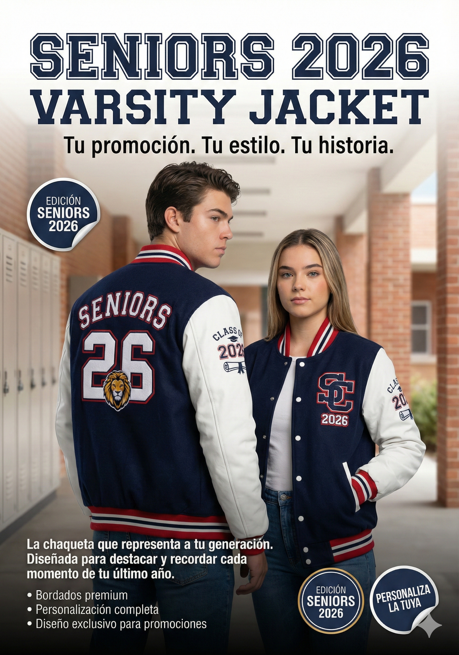 Nuestras chaquetas varsity para Seniors 2026 están diseñadas para promociones que quieren destacar, verse increíbles y llevarse un recuerdo que dura años.